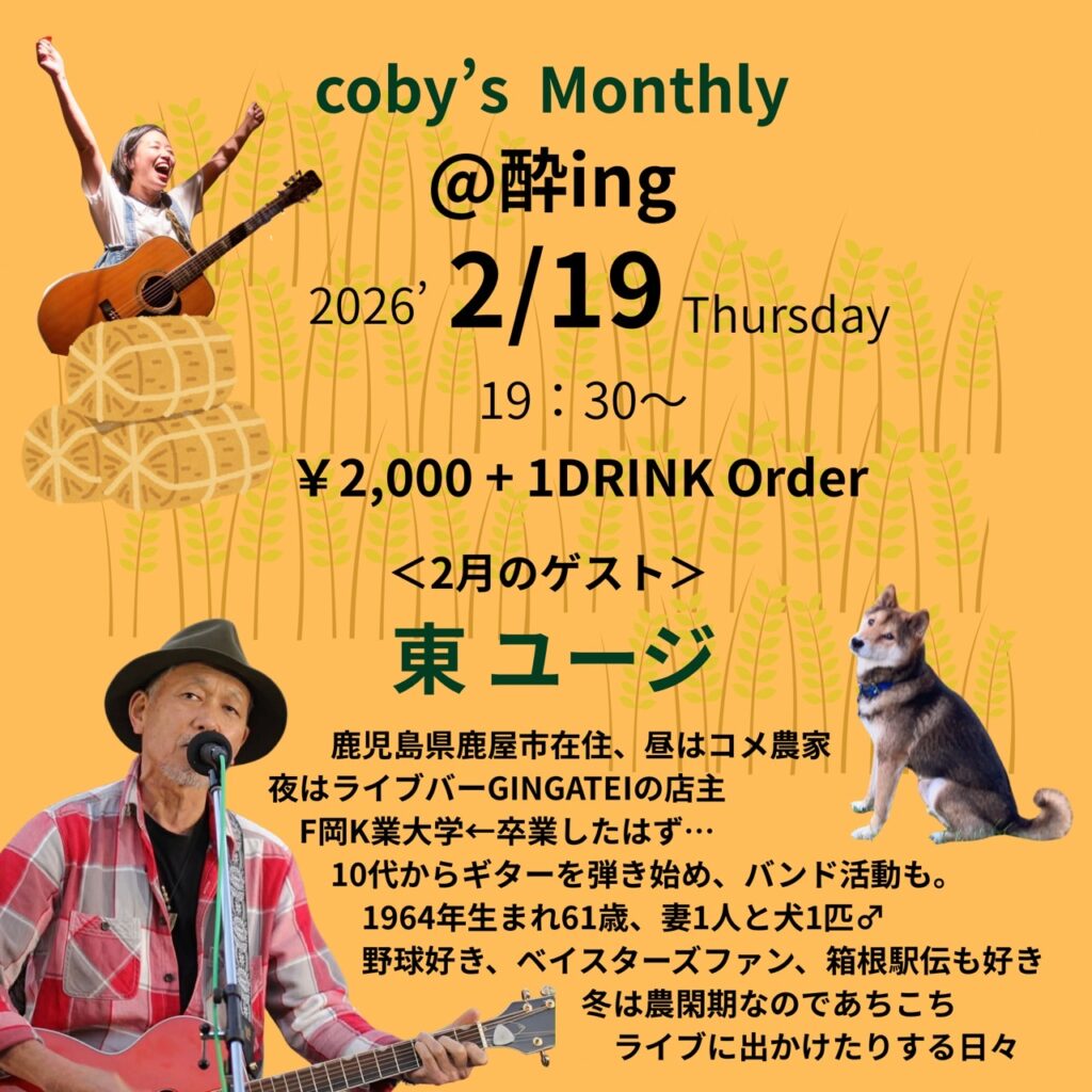 事前にLINE、メール、お電話などででご予約いただいたお客さまはお好きな席をキープいたします。ライブがある日も22:30以降は通常チャージ(¥800)になります。 11月20日(木) coby’s Monthly coby(vo, gt), Guest : UTYTY Open 19:00 Start 19:30 Charge ¥25... -