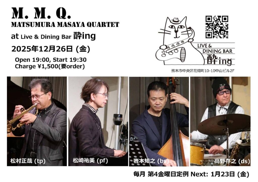 事前にLINE、メール、お電話などででご予約いただいたお客さまはお好きな席をキープいたします。ライブがある日も22:30以降は通常チャージ(¥800)になります。 10月23日(木) Bar 営業 Open 19:00 Charge ¥800 + order 10月24日(金) M. M. Q. 松村正哉(tp), ... -