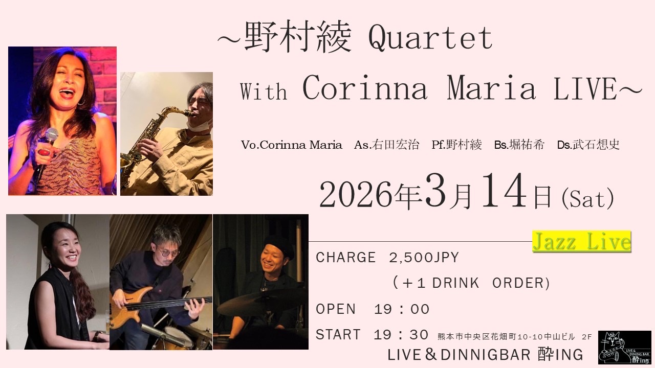 事前にLINE、メール、お電話などででご予約いただいたお客さまはお好きな席をキープいたします。ライブがある日も22:30以降は通常チャージ(¥800)になります。 3月1日(日) 原川誠司 Quartet feat. 田井中福司 from N.Y. 原川誠司(as), 北島佳乃子(pf), 金森... -